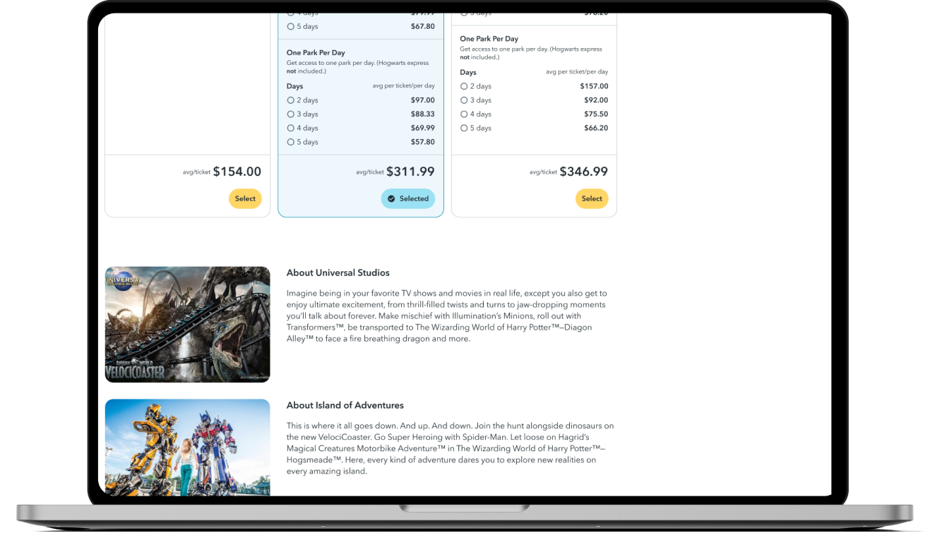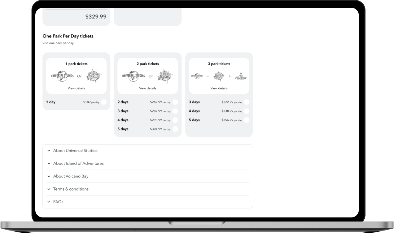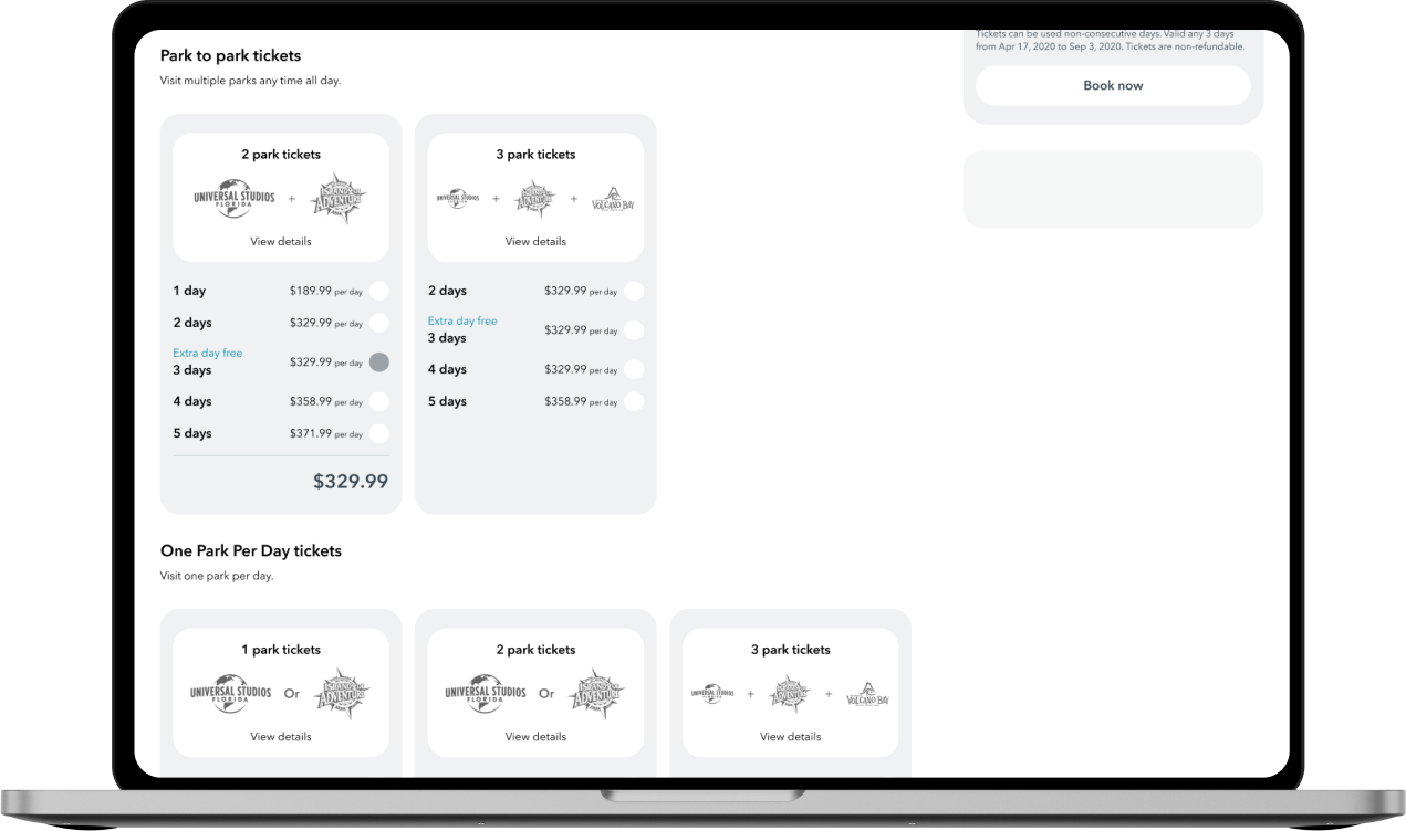 Simplified ticket options: I created a more streamlined interface that laid out the tickets by the type and number of days. I also added the parks each ticket type will take you to - this helped users understand the differences between each ticket option, so they could choose the one that was right for them.