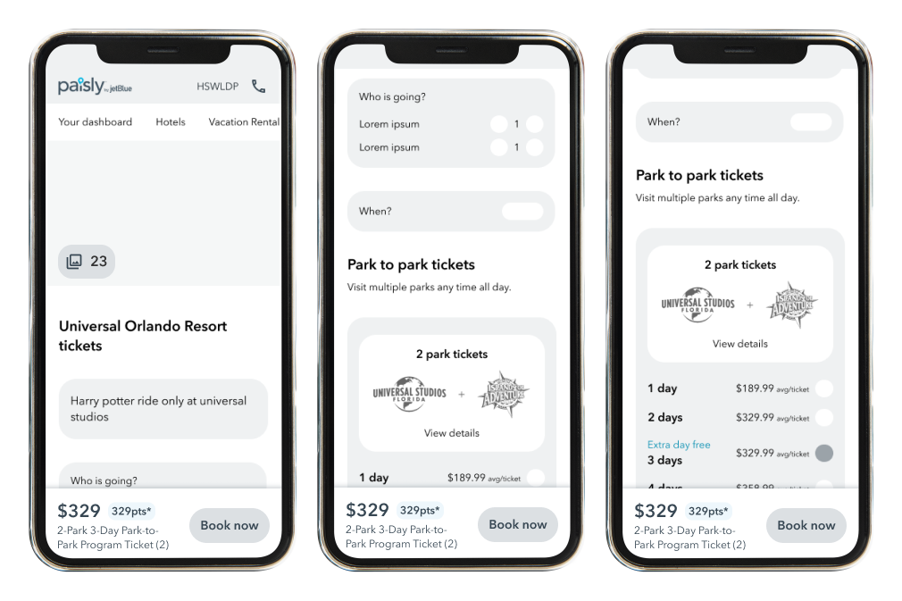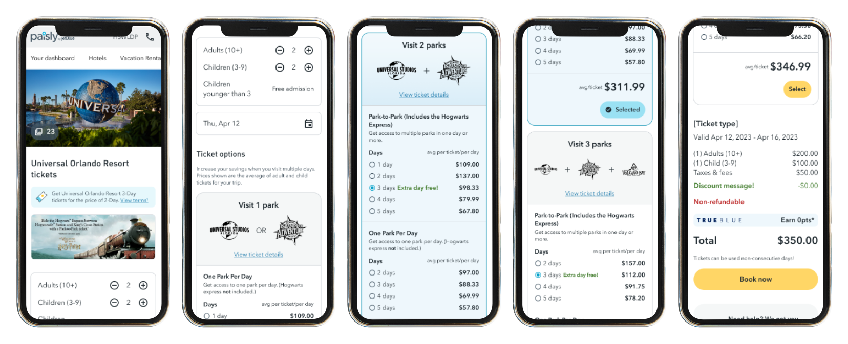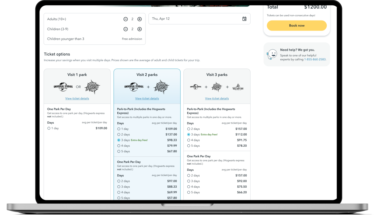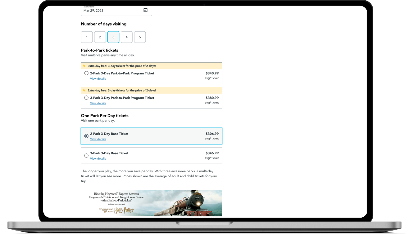 Simplified ticket options: I created a more streamlined interface that laid out the tickets by the type and number of days. I also added the parks each ticket type will take you to - this helped users understand the differences between each ticket option, so they could choose the one that was right for them.