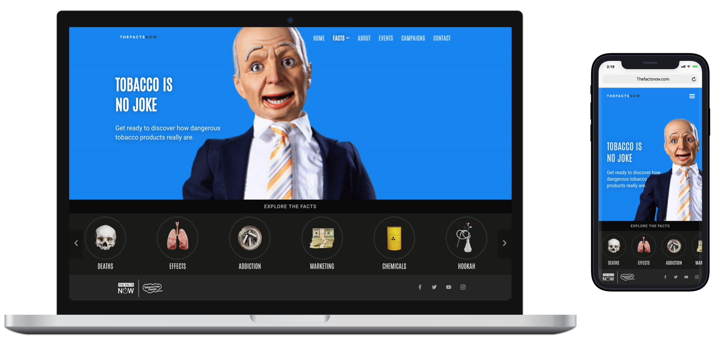 The Facts Now is a website that helps prevent young potential smokers aged 12-24 from becoming smokers by educating them about the harmful effects of tobacco.